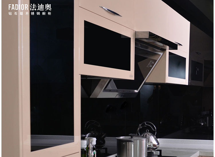 纠结了好久买木质的还是不锈钢的橱柜,最后被法迪奥橱柜的导购给说动了买的不锈钢橱柜,期待后期的使用效果