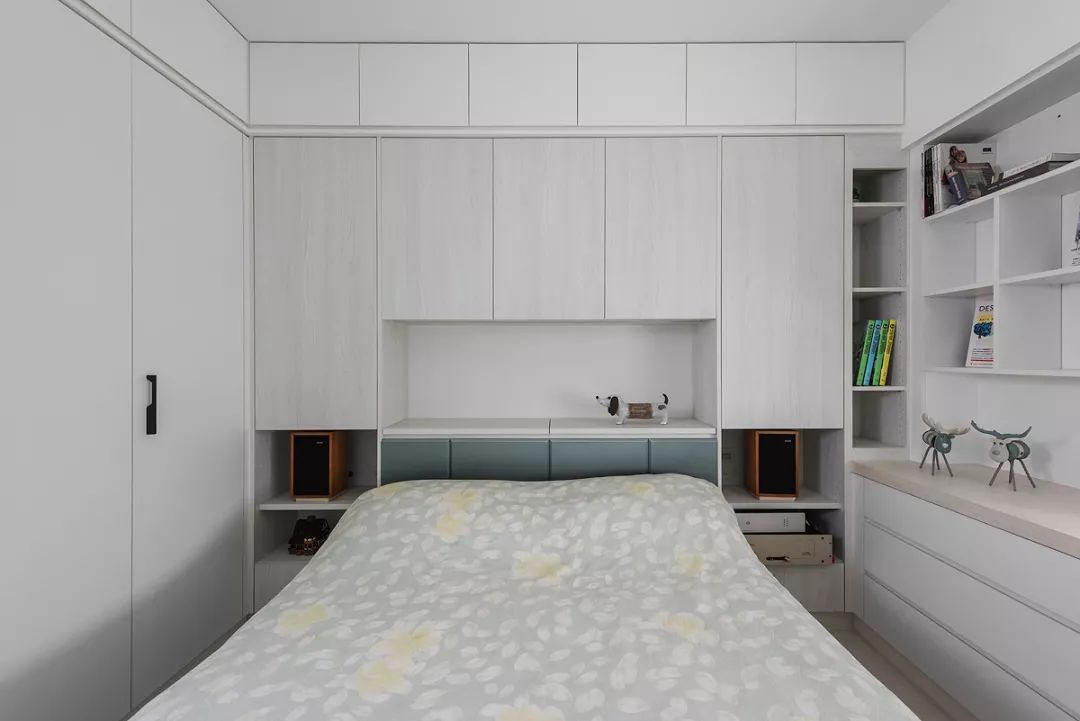 ▲宽度有限的小房间可以通过床头背景设计收纳柜体。