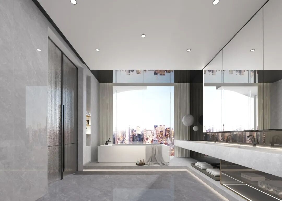 KMY托马斯灰完美契合于客餐厅、厨卫等空间,流畅的线条相互碰撞交汇,在光影虚实之间,丰盈着生活的趣味与格调。