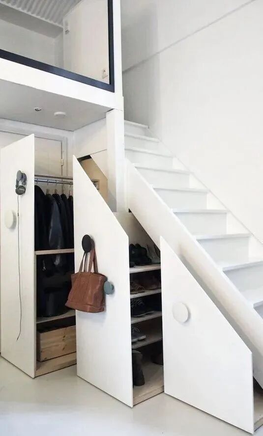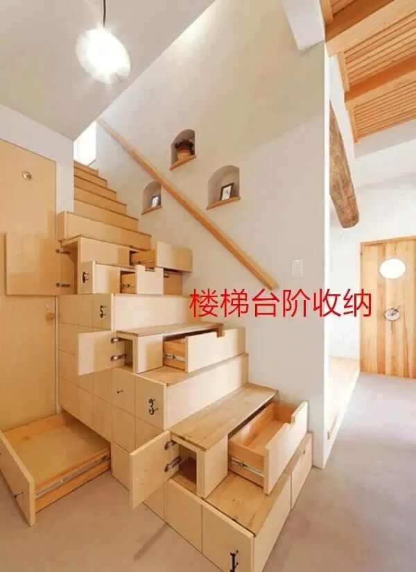 楼梯下方空间也可以利用起来,在墙壁内部打上储物柜,还可以作为衣帽间来使用。一边作为衣物收纳区,一边作为鞋子收纳区,是不是超级方便?