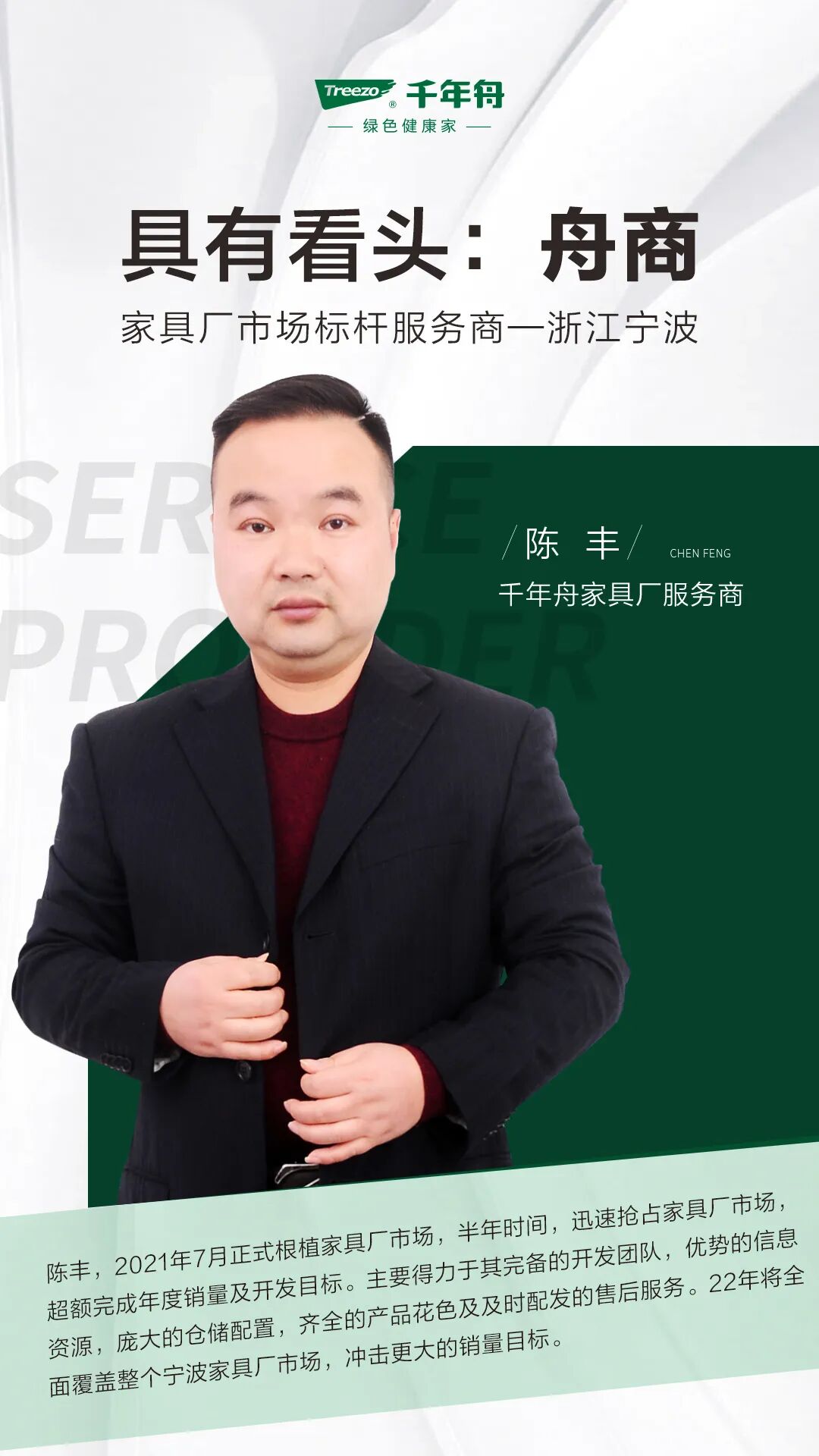 本期看头:陈丰,2021年7月正式根植家具厂市场,半年时间,迅速抢占家具厂市场,超额完成年度销量及开发目标。主要得力于其完备的开发团队,优势的信息资源,庞大的仓储配置,齐全的产品花色及及时配发的售后服务。22年将全面覆盖整个宁波家具厂市场,冲击更大的销量目标。