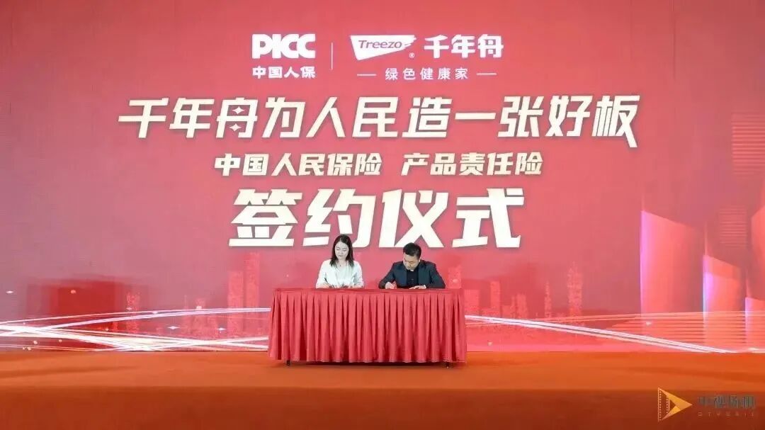 2021年板材与定制家居绿色生态链发展高峰论坛大会上,千年舟集团副总裁田茂华与中国人保代表现场完成签约仪式。千年舟旗下全线产品顺利通过中国人保审核,在未来几年,中国人保将为千年舟全部板材产品承保产品责任险,为消费者保驾护航。